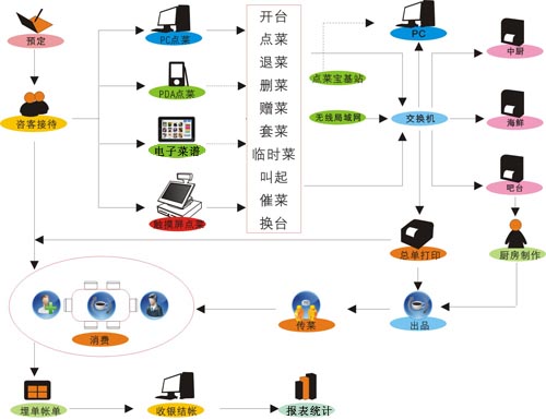 點(diǎn)菜操作:點(diǎn)菜、退菜、口味做法、套菜、換菜、贈(zèng)送、臨時(shí)菜、贈(zèng)送、推銷員、定折、一菜多吃、催菜、等叫、叫起、菜品轉(zhuǎn)臺(tái)、稱重、沽清